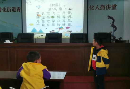 繆允哲小朋友帶領大家朗誦古詩:《村居》。他吐字清晰、聲音洪亮、韻感十足,贏得了大家的喜愛和熱烈的掌聲。