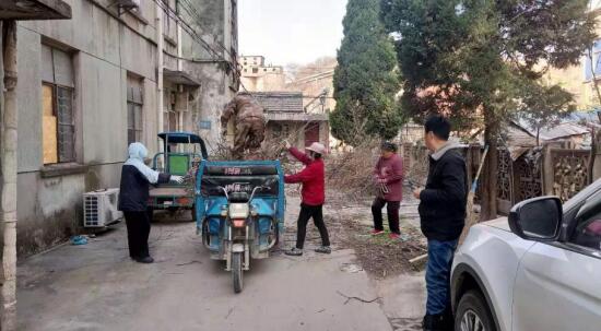 社區(qū)工作人員戴上手套,將散落在墻角、草叢、花壇內的枯樹枝一一撿起。工作人員用繩子將體積較小的枯樹枝捆成一捆,體積較大的由兩個人共同搬運至車上。每項工作都有條不紊地進行著,大家面對這些堆積已久的枯樹枝干勁十足,有的人的額頭沁出了細密的汗珠,在太陽的照耀下閃著細微的光。在搬運的過程中還會掉落一些枯葉和灰塵,細心的工作人員在搬運完畢后還拿來了掃帚將現場清理干凈。