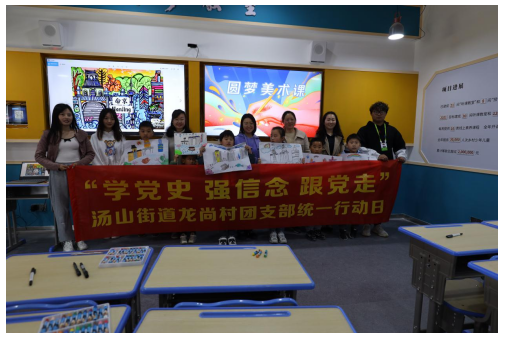 4月10日,湯山街道龍尚村團支部開展統(tǒng)一行動日活動,團市委副書記石磊、學少部、統(tǒng)戰(zhàn)部、團區(qū)委等一行18人參加,活動中走訪了困境青少年。江寧區(qū)湯山街道龍尚村邀請部分青聯(lián)委員在統(tǒng)一行動日走進圓夢教室,和小銀星藝術團的老師為圓夢教室參加此次繪畫展的孩子做藝術指導,共繪“我和我的家鄉(xiāng)”畫作獻禮建黨百年。