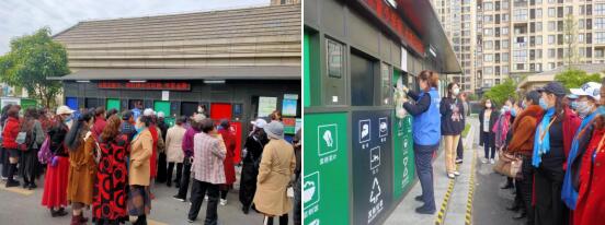 在統(tǒng)一組織下,“旅行團”一行實地參觀江寧街道居民小區(qū)生活垃圾分類智能箱房,聽取了定時定點分類投放方式介紹,垃分督導(dǎo)員向大家現(xiàn)場演示智能箱房的操作流程并講解垃圾分類實用技巧。