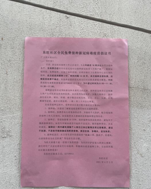 一是在東旺社區(qū)網(wǎng)格內(nèi)各處張貼新冠疫苗接種宣傳和相關(guān)通知;在宣傳欄張貼海報,就接種人群要求、接種新冠疫苗應(yīng)注意的事項等進行科普宣傳;網(wǎng)格員和村長一對一進行入戶走訪,宣傳接種疫苗,及時做好村民疫苗接種登記預(yù)約,為居民提供更加人性化的特色便民服務(wù),全力保障接種點的接種工作順利進行。