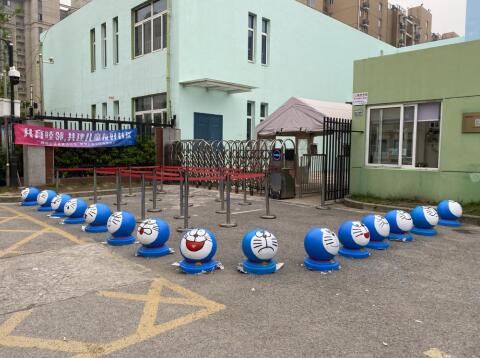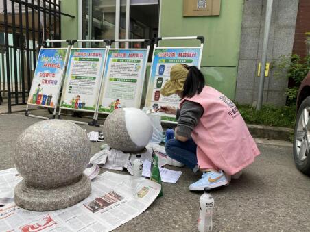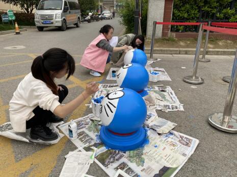 轄區(qū)內(nèi)的九鄉(xiāng)雅苑幼兒園門口共有15個(gè)石球,其功能是阻止車輛穿行,但是水磨石冷冰冰光禿禿的表面有煞風(fēng)景?;顒?dòng)前期,社區(qū)婦聯(lián)、社會(huì)組織、幼兒園進(jìn)行了前期溝通,結(jié)合幼兒園自身的特色,多次溝通后選定了多啦A夢(mèng)的彩繪方案。