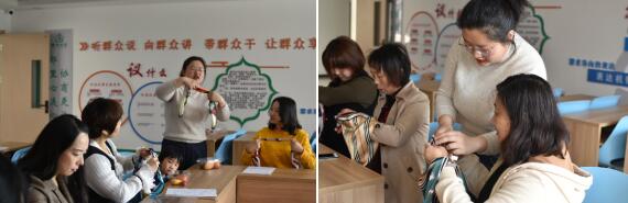 “將右側的絲帶放在左側絲帶上方,并從領口處掏出。”在社工的指導下,居民們開始練習平扣結的系法。對未成功的居民,社工進行了一對一指導。幾次練習之后,居民們都成功打出平扣結。相較于平扣結,玫瑰結難度大一點,社工針對每位居民的打結情況,逐一指導,居民們認真練習玫瑰結的系法。美麗的玫瑰結受到居民們的喜歡,和媽媽一同參加活動的小朋友們化身小模特,領口扎著漂亮的玫瑰結,展示著媽媽的絲巾手藝。之后社工向居民們展示愛馬仕結的系法,此結法難度最大,居民們彼此幫助身邊的人,幾次練習后,居民們掌握了愛馬仕結的系法。