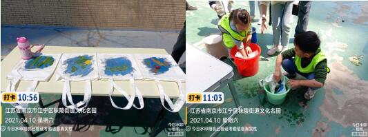 在志愿者和老師的幫助下,將特殊的藍(lán)曬液體刷到帆布包上,按照自己的喜好和審美將植物擺放固定好,放到陽光下暴曬。等待的時間里,志愿者老師帶領(lǐng)小朋友們通過袋鼠跳跳的游戲,增加親子互動,鼓勵家長和小朋友們配合完成比賽。半小時后,小朋友們將帆布袋上的蓋片揭開,放進(jìn)水桶里沖洗,見證了顯影的過程,晾干后,就能夠?qū)⒋喝绽锏闹参镉跋耖L久保存。在這個過程中,我們需要與陽光,大自然協(xié)同合作,享受自然,感恩饋贈。在大自然中找尋素材,在制作中感受自然界的花草,感受大自然給予的饋贈,作為一種藝術(shù)創(chuàng)作的媒介,它是用一種特殊的方法,以另一種形式延續(xù)了植物的生命,將其永久的保存下來。每一個作品,都是一份獨一無二的禮物。