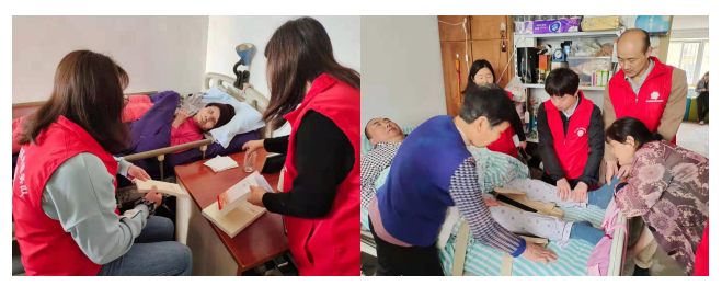 高位截癱村民賈永建高興地說,你們又來了,說話間,志愿者李維明就熟練地為賈永健按摩腿,并對他帶來一點蔬菜送給他;獨自住在新民花苑6層的90高齡視力高度近視的老人鄧可英聽到我們的聲音,可高興了,聽說我們?yōu)樗郎蕚淞耸卟?,說這下我可不用請鄰居幫我買了。