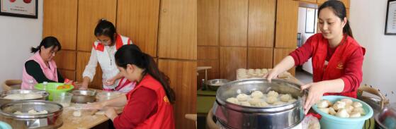 志愿者們一大早就來到了村活動室內,準備好做面點所需要的材料:面粉、酵母、糖、鹽、水和肉等。把面粉和成團,把肉切碎并攪拌,搟皮、包餡,志愿者們分工合作,活動室內一派熱火朝天。隨著一陣香味從蒸籠里傳來,一個個飽滿的包子出爐了。