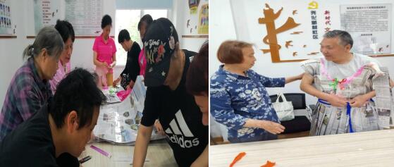 活動(dòng)開始,居民們就紛紛自己動(dòng)手,大家集思廣益、發(fā)揮想象力,對日常生活中的常見廢舊報(bào)紙、垃圾袋、包裝繩等垃圾進(jìn)行創(chuàng)新再利用,不一會(huì),各式各樣的服裝就做好了,乳腺癌康復(fù)期的蔣阿姨穿著用舊報(bào)紙做的連衣裙第一個(gè)亮相,踩著自信的步伐走上舞臺(tái),還有王叔叔穿著愛人親自做的斗篷帽子也亮相舞臺(tái)中間,張阿姨穿著廢棄塑料布做成的圍裙很隨意的走上臺(tái),雙手叉腰擺起了造型,