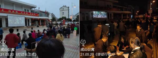 居民們齊坐廣場上,一同觀看紅色電影《打過長江去》。一直以來,表現(xiàn)渡江戰(zhàn)役的影視作品多不勝數(shù),但是描繪渡江戰(zhàn)役前的先遣隊的戰(zhàn)斗與抗?fàn)幍淖髌?,卻并不多見?!洞蜻^長江去》是一部角度新鮮又足夠?qū)憣嵉膼蹏髁x戰(zhàn)爭電影,影片歌頌了許多為了祖國的解放而奉獻(xiàn)和犧牲的無名英雄們,他們倒在了黎明前的最后一刻,卻讓解放的腳步變得更加堅實而穩(wěn)健。在和平年代,重現(xiàn)曾經(jīng)的斗爭,重溫曾經(jīng)的壯烈,讓在場的居民們內(nèi)心大為震撼。隨后,居民們又一起觀看了臥底題材的警匪片《使徒行者2》,影片帶動了觀眾一起找臥底,情節(jié)新穎,對居民產(chǎn)生了很大的吸引力。