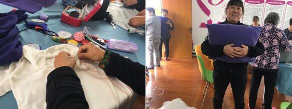 最后,大家各自分享講述自己的作品,講述著帶回家里準(zhǔn)備怎么用,有的說(shuō)腰不好可以放在椅子上靠著,有的打算坐沙發(fā)上看電視的時(shí)候抱著,有的拿回去給孩子用,有的要放在床頭靠著。大家都覺得非常的實(shí)用,家里的舊衣服有了“用武之地”。