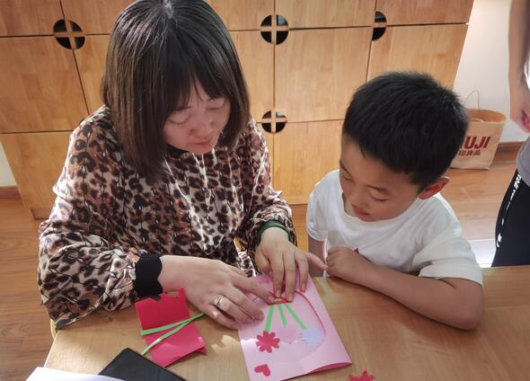 活動中小朋友在挑選了自己喜歡的材料后,有的用卡紙折疊,剪出弧度,再分別粘貼,有的用彩色水筆寫上對媽媽說的話。在志愿者的指導(dǎo)下,小朋友們充分發(fā)揮想象力,用靈巧的雙手繪制出了一張張精美的賀卡。