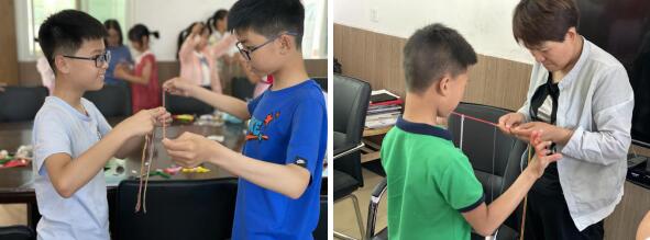 木蘭花開的志愿者們早早就準(zhǔn)備好了白白胖胖的鴨蛋,等待著小朋友們親手為鴨蛋制作一個(gè)“小家”——彩色蛋兜。兩位社工先給孩子們演示,再講孩子們兩兩分組,相互配合著編織網(wǎng)袋。孩子們小心翼翼地將鴨蛋放進(jìn)掛在胸前的網(wǎng)袋中,相互欣賞,體會老一代兒時(shí)記憶中曾有的歡樂。