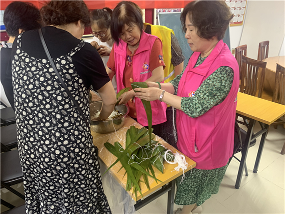 結(jié)束了講解后迎來了重頭戲——包粽子。志愿者提前準(zhǔn)備好了糯米、粽葉、蜜棗等物品,“七彩”志愿者們與居民一起包粽子,其中時(shí)間銀行的志愿者動作十分嫻熟,她把粽葉折成錐形,放入糯米和蜜棗,折疊粽葉,用棉線捆扎不一會一個(gè)棱角分明的粽子就成了;工會志愿者也不甘落后,一折一裹還沒看個(gè)明白粽子也包好了;年輕的志愿者不會包,老年黨員志愿者手把手來教,活動室里歡聲笑語,不一會兒一個(gè)個(gè)粽子就如雨后春筍班出現(xiàn)在了桌子上。