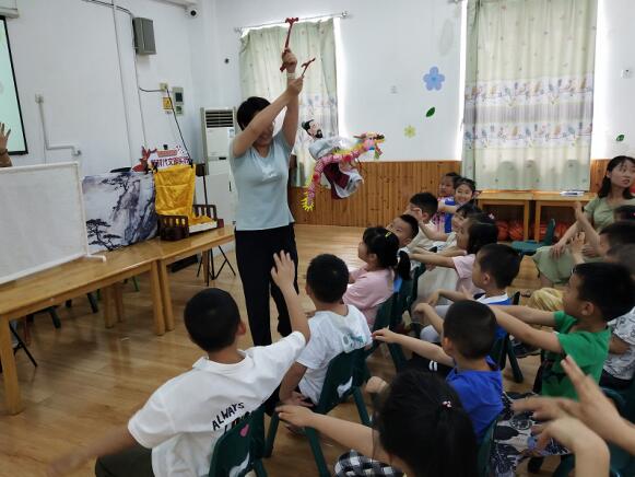 此次新時(shí)代文明實(shí)踐站走進(jìn)燕子磯幼兒園,并邀請(qǐng)棲圖表演團(tuán)隊(duì)表演原創(chuàng)木偶劇《葉公好龍》,該劇將中國傳統(tǒng)故事與皮影戲、提線木偶相結(jié)合,富有涵義且不失趣味。
