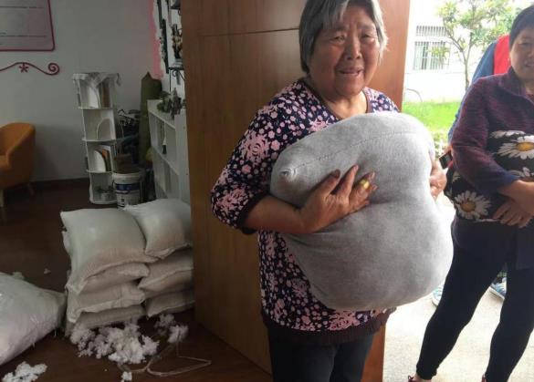 最后,大家各自分享講述自己的作品,講述著帶回家里準備怎么用,有的說腰不好可以放在椅子上靠著,有的打算坐沙發(fā)上看電視的時候抱著,有的拿回去給孩子用,有的要放在床頭靠著。大家都覺得非常的實用,家里的舊衣服有了“用武之地”。