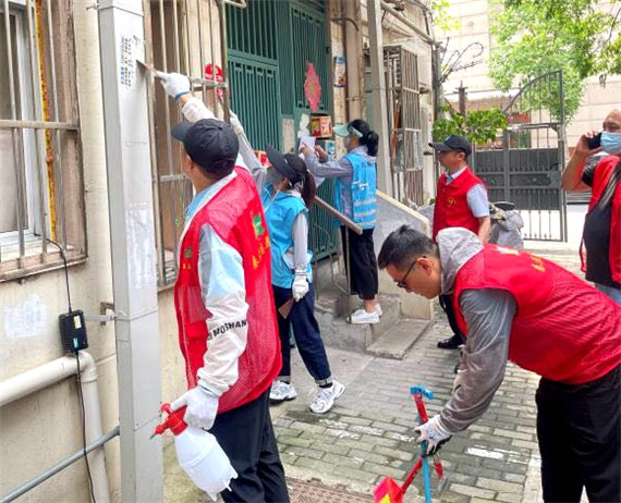 社區(qū)與志愿者打掃街頭巷尾居民區(qū)環(huán)境衛(wèi)生