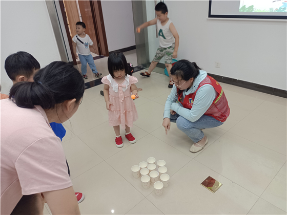 本次活動設(shè)置了拍皮球比賽、紙杯乒乓球、拋接沙袋等簡單又有趣的游戲項目。每一游戲環(huán)節(jié),社區(qū)志愿者都仔細講解了游戲規(guī)則,指導(dǎo)孩子們有序參與進來,孩子們邊玩游戲邊贏獎品,玩得不亦樂乎。家長們在一旁看著,也樂在其中。