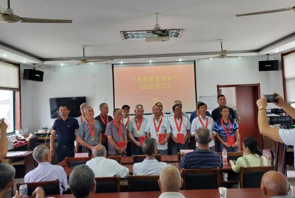 從1921年到2021年,中國共產(chǎn)黨走過了整整一百年歷程。百年之中涌現(xiàn)出無數(shù)令人敬仰的優(yōu)秀共產(chǎn)黨員,為社會主義事業(yè)做出巨大貢獻。此次頒發(fā)“光榮在黨50年”紀念章,是對具有50年以上黨齡黨員的集體致敬。工作人員為現(xiàn)場擁有50年黨齡的老黨員頒發(fā)“光榮在黨50年紀念章”。在喜慶熱鬧的樂曲聲中,年逾古稀的老黨員們戴上榮譽勛章,臉上洋溢著自豪的笑容,小小的勛章凝聚了他們的奉獻和榮耀。