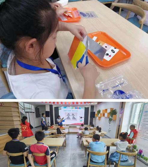 一張擁有不同動物部位的彩紙,如何把它們變成一個完整的動物呢?科普活動現(xiàn)場,橋頭社區(qū)的工作人員引導(dǎo)著孩子們進(jìn)行著思考。作為這次“小魔盒”制作成功的關(guān)鍵條件,光的折射是必須要掌握的知識。從不同的圖片、日常生活示例入手,工作人員將其中原理介紹給小朋友們,讓他們能從身邊事思考其中隱藏的知識。從卡片剪裁到內(nèi)盒與外盒的拼接,再到最終成像,在工作人員的耐心講解下,小朋友們最終成功將分散的部分拼成了一個個可愛的動物頭像。