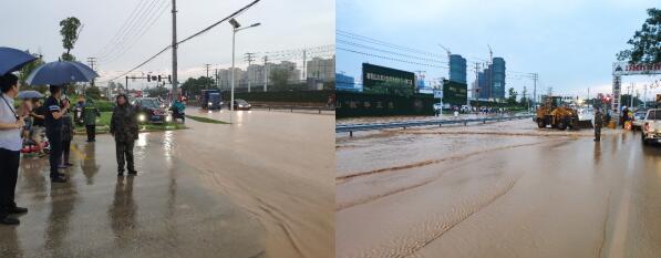之后,社區(qū)工作人員又發(fā)現(xiàn)紅楓片區(qū)保障房錢道路大面積淹水,針對(duì)這一情況,社區(qū)工作人員到達(dá)現(xiàn)場(chǎng),并立刻聯(lián)系市政管理處等相關(guān)部門,經(jīng)過多方協(xié)調(diào),安排3輛裝載機(jī)到達(dá)現(xiàn)場(chǎng),對(duì)路面積水進(jìn)行全面清理。同時(shí)為加速清理積水,社區(qū)工作人員穿著雨衣,打開窨井蓋,經(jīng)過2個(gè)小時(shí)的奮戰(zhàn),成功將路面積水基本排空,道路交通恢復(fù)暢通。