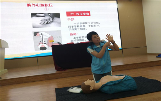 心肺復(fù)蘇術(shù)CPR環(huán)節(jié),劉老師通過(guò)“一看二喚三呼”、“左手在下、右手在上、十指相扣、指尖翹起”、“30+2”(30次胸外按壓+2次人工呼吸)、“仰頭抬頜”等關(guān)鍵詞教學(xué),以及現(xiàn)場(chǎng)實(shí)際操作演練,形象生動(dòng)地指導(dǎo)大家如何進(jìn)行心肺復(fù)蘇急救,進(jìn)一步增強(qiáng)了大家自救互救的“救命”本領(lǐng)。社區(qū)青年黨員王文文連連稱贊:“這次活動(dòng)讓我們受益匪淺,孩子們?cè)谕嬷袑W(xué),增長(zhǎng)了不少自救知識(shí),為社區(qū)點(diǎn)贊!”