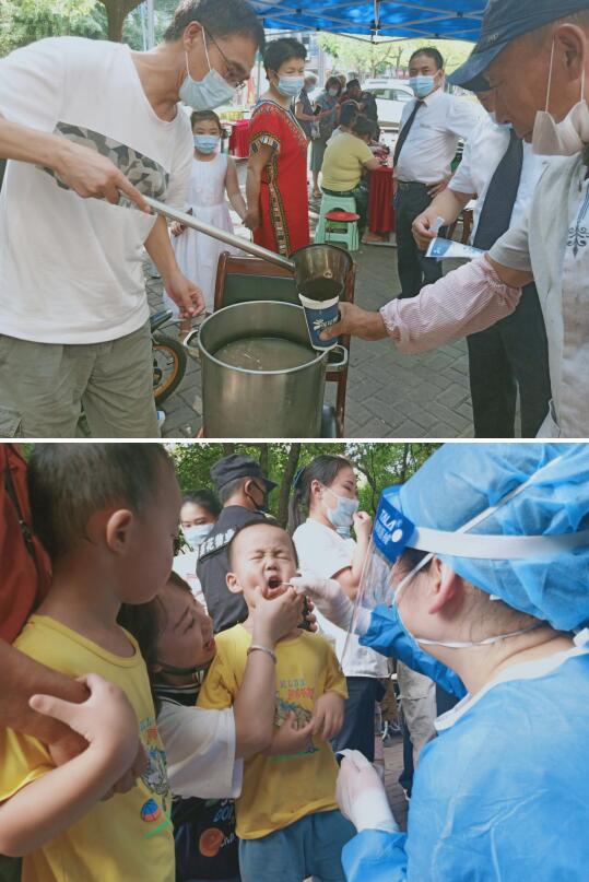 下午四點(diǎn),太平社區(qū)等來了試劑和醫(yī)護(hù)人員,沒有一刻停歇,社區(qū)工作人員聯(lián)合醫(yī)護(hù)人員連忙投入到核酸檢測(cè)的工作中。盡管天氣炎熱,但不少居民還是下午早早就來到了現(xiàn)場(chǎng)排隊(duì),為了緩解大家的暑氣,社區(qū)志愿者為排隊(duì)的居民準(zhǔn)備了綠豆湯,給居民帶來一絲清涼。截止到半夜12點(diǎn),太平社區(qū)的核酸檢測(cè)工作基本完成,短短八小時(shí)內(nèi),太平社區(qū)完成了全社區(qū)90%以上的人員檢測(cè),在這之中,不乏一些走路還不穩(wěn)的小朋友。
