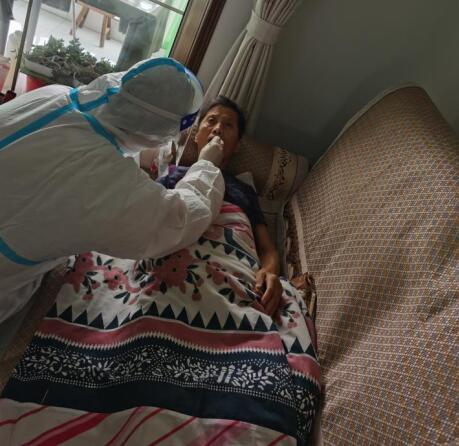 在核酸檢測(cè)的工作進(jìn)行中,一位老人引起了醫(yī)護(hù)人員和社區(qū)工作人員的特別注意。老人因重病住進(jìn)南京市鼓樓醫(yī)院,14號(hào)剛剛出院,目前仍處于臥床不能自理的狀態(tài),根本無(wú)法到檢測(cè)點(diǎn)現(xiàn)場(chǎng)做核酸檢測(cè)。針對(duì)這一情況,社區(qū)工作人員決定帶著醫(yī)護(hù)人員上門給老人做核酸檢測(cè),真正做到全覆蓋,不落一戶、不漏一人。