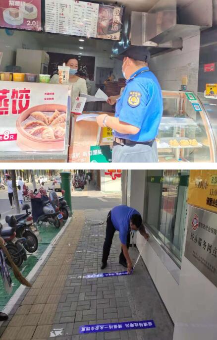 持續(xù)加大日常巡查力度,抓好對轄區(qū)內(nèi)沿街商鋪、大型商超、農(nóng)貿(mào)市場等重點區(qū)域的巡查管控,要求每日進行不少于2次的消毒消殺和體溫測量,每次進行不少于30分鐘的通風(fēng)換氣,做好信息記錄,對檢查中發(fā)現(xiàn)的防疫落實不到位的責(zé)令其立即整改到位。同時安排人員在沿街門店醒目位置張貼“請佩戴口罩入場”的溫馨提示,對不佩戴口罩者,拒絕入內(nèi);在商超入口、收銀臺等處張貼“一米線”標識,提醒居民自覺保持安全距離排隊,確保人員無近距離接觸,筑牢疫情防控安全防線。