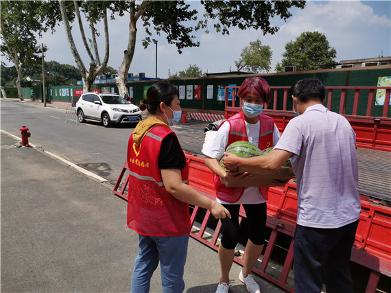 連日的高溫酷暑讓人們酷熱難耐,當(dāng)天正值立秋,按照傳統(tǒng)習(xí)俗都要吃西瓜,意用西瓜“啃”去余夏的暑氣,“啃”下“秋老虎”,迎接涼爽的秋季。8月7日,南京市棲霞區(qū)棲霞街道棲霞社區(qū)黨委聯(lián)合新時(shí)代文明實(shí)踐站帶上一車西瓜走訪慰問了冒著酷暑?yuàn)^斗在轄區(qū)卡口的一線防疫人員,讓他們高高興興地“啃秋”,感受我們大家庭的溫暖。