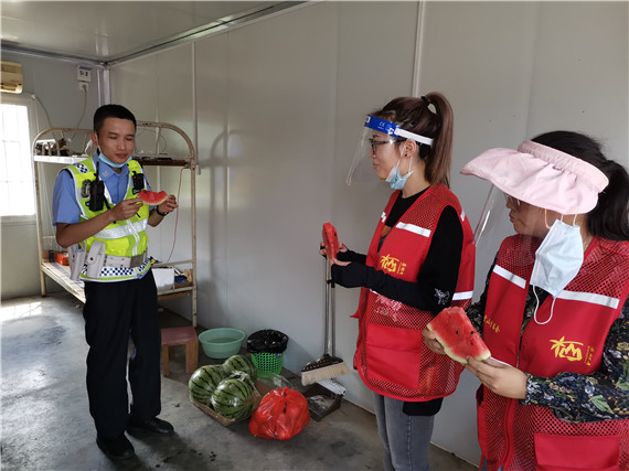 現(xiàn)場(chǎng)值守人員正在對(duì)進(jìn)出車輛司乘人員進(jìn)行體溫檢測(cè),查看其健康碼并提示戴好口罩??谧钄嗟氖遣《?,連接的卻是愛心。“來來來,大家先停下來,吃點(diǎn)西瓜。”志愿者們熱情地向正在卡口值班值守的工作人員打著招呼,并讓他們吃點(diǎn)西瓜,消除暑熱。每到一個(gè)卡口處,社區(qū)黨委副書記林守香都會(huì)與堅(jiān)守在卡口值守人員進(jìn)行親切的交談,并叮囑一線人員在高溫下要注意休息,同時(shí)對(duì)他們堅(jiān)守崗位、恪盡職守、舍小家顧大家、無私奉獻(xiàn)的精神表達(dá)崇高的敬意。“這西瓜吃起來比往年甜多了,這是一口有溫度的瓜。”老街卡口值守人員一邊“啃”著西瓜,一邊說道。