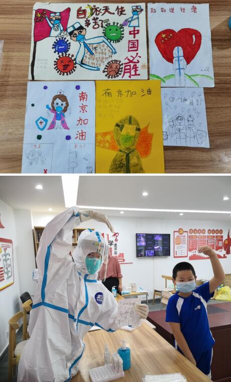 “白衣天使辛苦了!”“致敬逆行者!”……8月13日,在南京市江寧區(qū)湖熟街道徐慕村楊家核酸采集點,周崗小學的學生們?yōu)獒t(yī)護人員送來了自己親手繪畫的作品,表達對一線工作者的感激與敬佩之情。