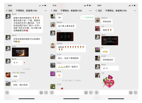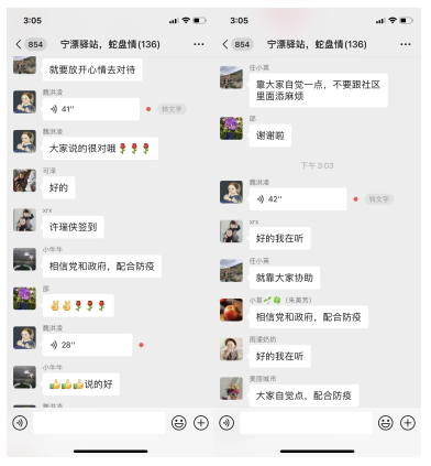 線上服務中,采用文字+圖片+語音方式開展。指導老師首先指出大家情緒焦慮的原因與應對方式,隨后就大家普遍關注的健康、親子關系、就業(yè)、個性化需求問題提供相關建議與解決思路,獲得了參與居民的一致認可,大家也在群內分享起自己解決各類問題的經驗,紛紛表示會積極配合防疫各項工作,共戰(zhàn)疫情。