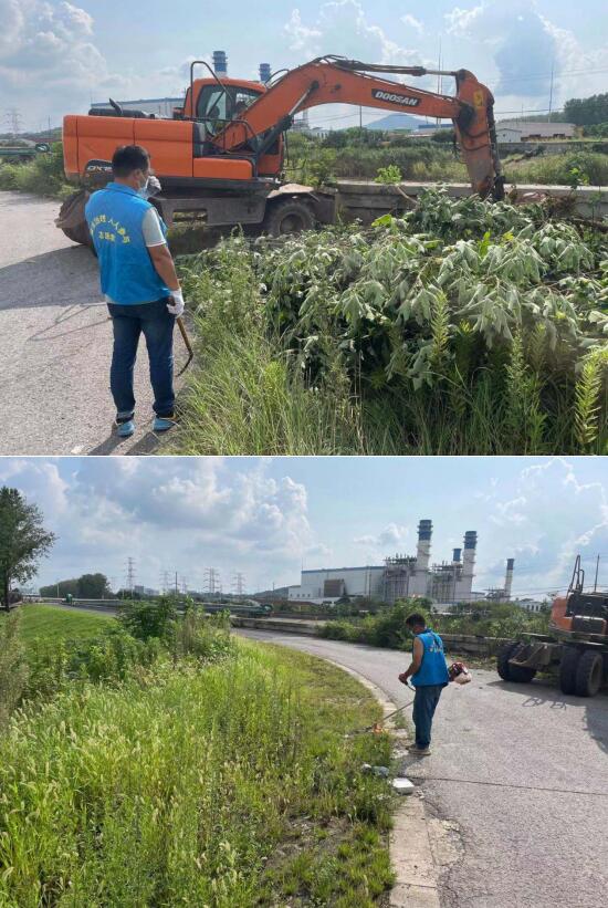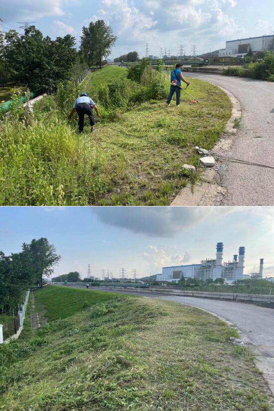 志愿者們先是對(duì)堤岸附近進(jìn)行仔細(xì)巡查,發(fā)現(xiàn)雜草生長茂盛,并且草叢中還留有諸多枯枝、石塊、垃圾袋等雜物。于是,志愿者們便頂著烈日,充分發(fā)揮不怕臟、不怕累的精神,分成兩組,一組指揮挖機(jī)清理迎水面的雜草,另一組使用除草機(jī)清除背水坡的雜草,雙管齊下。經(jīng)過1個(gè)多小時(shí)的奮戰(zhàn),雜樹雜草全部清除干凈,為巡堤工作提高了安全保障。