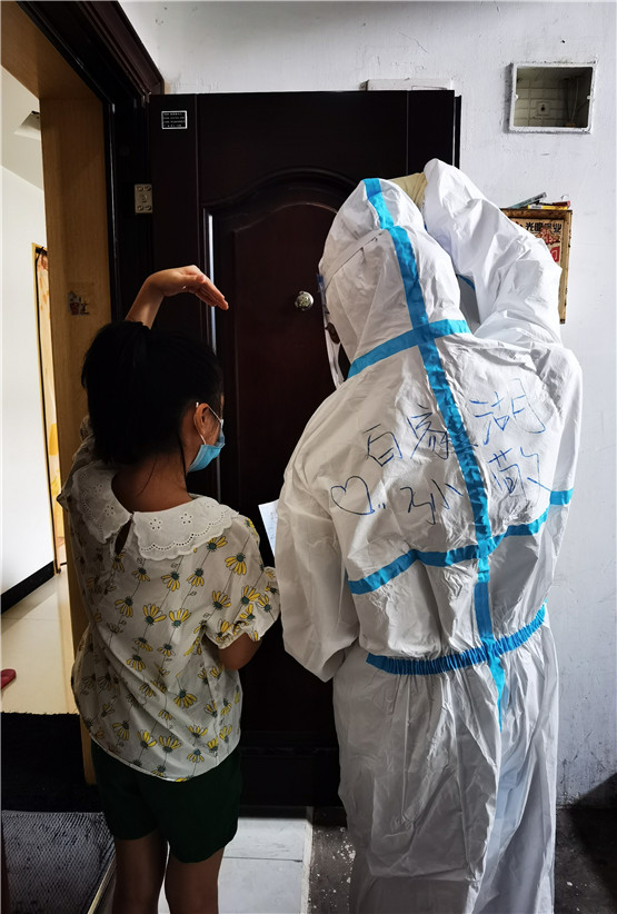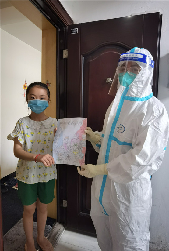 我們的“大白”醫(yī)務(wù)姐姐上門給居民做核酸的路上,收到了一份禮物,是來(lái)自南京市江寧區(qū)秣陵街道長(zhǎng)山社區(qū)楊虞欣小朋友自己親手畫的畫送給了核測(cè)醫(yī)務(wù)人員,并向他們豎起大拇指,送上了自己的心意。