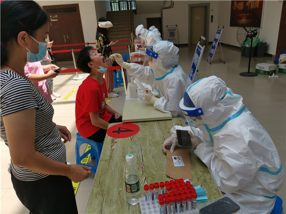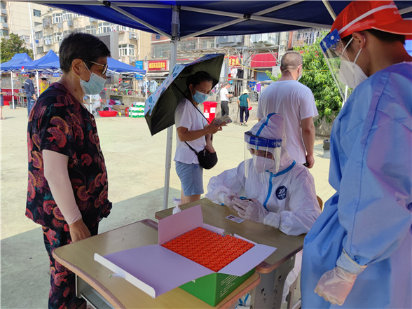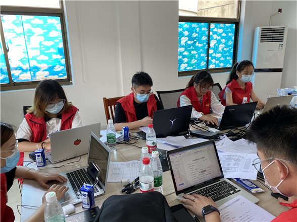 在烈日炙熱的核酸檢測現(xiàn)場,志愿者高文慧、李佳欣、鐘欣雨三人頂著高溫酷暑一直堅(jiān)守在集中檢測點(diǎn)。錄入居民身份信息、引導(dǎo)居民有序排隊(duì)、協(xié)助解決群眾的疑難困惑……一輪又一輪的核酸檢測現(xiàn)場都有她們?nèi)说纳碛?。由于整天都需要穿上厚厚的防護(hù)服,加上天氣炎熱,一整天工作下來,她們的衣服都被汗水浸濕。
