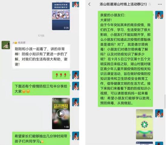 “有這樣的講座課程,可以代替集中教育,真的很好。”“聽了這個(gè)云課堂,對(duì)于疫情防控知識(shí)有了更加深入的了解,點(diǎn)贊!”......在湖山村線上活動(dòng)群中,青少年兒童在家長(zhǎng)的陪伴下一同觀看了疫情防控科普視頻,聆聽了工作人員分享的疫情防控三句半,線上學(xué)習(xí)氛圍十分濃厚。
