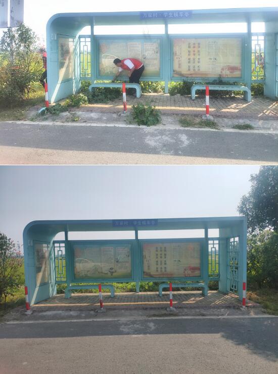在清理工作中,志愿者們積極配合,全力以赴,有的用鐮刀割草,有的撿拾垃圾,有的用掃帚掃清蛛網(wǎng),有的鏟除牛皮癬。為防止蚊蟲滋生,志愿者們將清理完的雜草馬上清掃扔走。在志愿者們共同努力下,候車亭很快就嶄新如初。“我們給孩子們清理好候車亭,孩子們就能在干凈安全的地方等校車了。”
