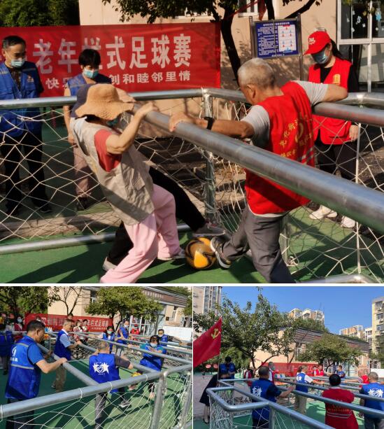 9月6日,讓居民們期待已久的欄式足球終于露出了廬山真面目。欄式足球以其適合老年人的“安全、健身、趣味、和睦鄰里”的特點,在許多老年人之中備受歡迎。整個“足球場”占地不過十幾平方米,由幾根欄桿和球門組成。沙書記率先拿著足球,為大家講解游戲規(guī)則,并邀請10名居民參與游戲演示,在場的老人們踴躍報名,居民們也紛紛下場親身感受游戲的樂趣。“5個人一組,一個守門員。叔叔阿姨站好位置,扶好欄桿,注意安全。我們的目標是把球踢進對方的球門里……”在沙書記講解完后,游戲正式開始。叔叔阿姨們很快掌握了游戲規(guī)則,各個精神矍鑠,很快就拿下比賽的第一分。看到老人們對這個項目興趣盎然,沙書記提議往后可以經(jīng)常開展小區(qū)居民之間的比賽,通過游戲促進中老年人的身體健康,大大提高居民凝聚力,得到了老人和居民的支持。