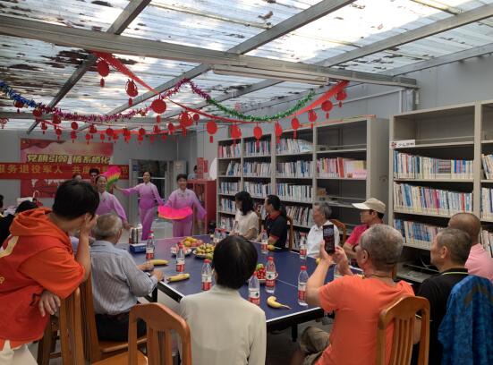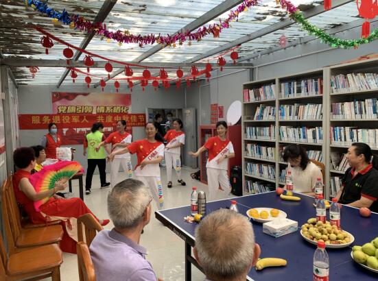 活動現(xiàn)場,退役老黨員們圍坐在一起,品美食、看演出。穿上紅裙子、拿起粉扇子……在歡快的音樂伴奏下,志愿者們熱情地跳起舞蹈、唱起歌謠,讓氣氛瞬間達到高潮。退役老黨員們則認真地欣賞著志愿者們的表演,還不自覺地跟著音樂哼唱起來。