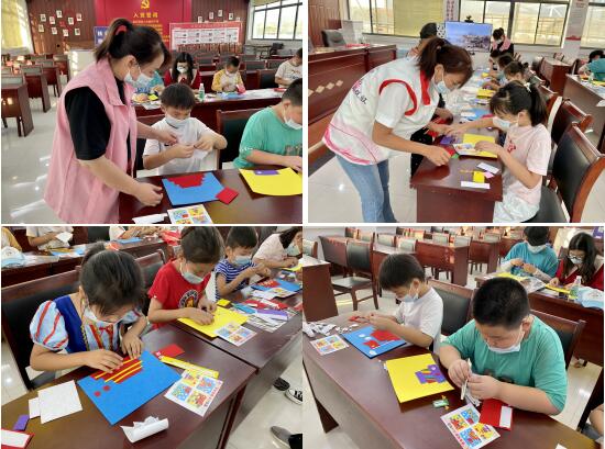 鮮艷的五星紅旗、彩色的多層蛋糕、莊嚴(yán)肅穆的天安門廣場(chǎng)、展翅飛翔的和平鴿……孩子們親自動(dòng)手,在工作人員的指導(dǎo)下,在彩紙上貼上一個(gè)個(gè)貼畫,用自己的方式為祖國(guó)母親慶生。