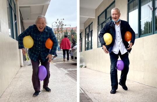 企鵝漫步的環(huán)節(jié)需要將兩個氣球夾在腋下,走到指定位置再返回,期間氣球不能落地、不能擊破。這個具有挑戰(zhàn)性的內(nèi)容,對于老人們來說也是小菜一碟,在歡聲笑語中,將氣球運送了回來。