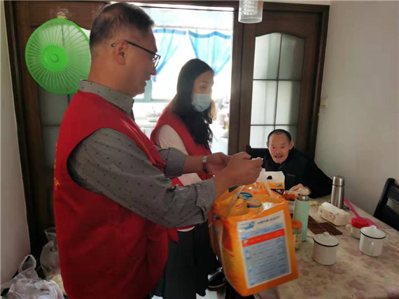 首先堯安殘聯(lián)的工作人員去到的是楊志成老人家中,楊老今年十月就八十周歲了,他因?yàn)榍皫啄曛酗L(fēng)導(dǎo)致肢體殘疾。一進(jìn)門,楊老的妻子便熱情招待了殘聯(lián)工作人員,楊老坐在沙發(fā)上,看得出來,因?yàn)樯鐓^(qū)殘聯(lián)的到來他很開心。殘聯(lián)的工作人員也熱心的詢問楊老的身體情況,楊老的妻子告訴我們:“他的身體還可以,平時天氣好了也會扶著他下樓散散步。這幾天天氣不好,他只能在家里走走。偶爾還能幫我剝剝蒜。”殘聯(lián)工作人員聽后連連夸贊楊老,并囑咐他們,近期降溫了,要注意身體。這次慰問,殘聯(lián)為楊老準(zhǔn)備了尿不濕、護(hù)理墊等生活用品,希望對他夜晚睡覺有所幫助。隨后,在楊老妻子的感謝聲中,堯安社區(qū)殘聯(lián)離開了楊老家,前往其他殘疾老人家中。