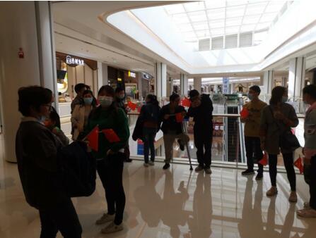 八點半,三十多名殘疾人已到達影院門口,工作人員為大家發(fā)放影票及小紅旗。