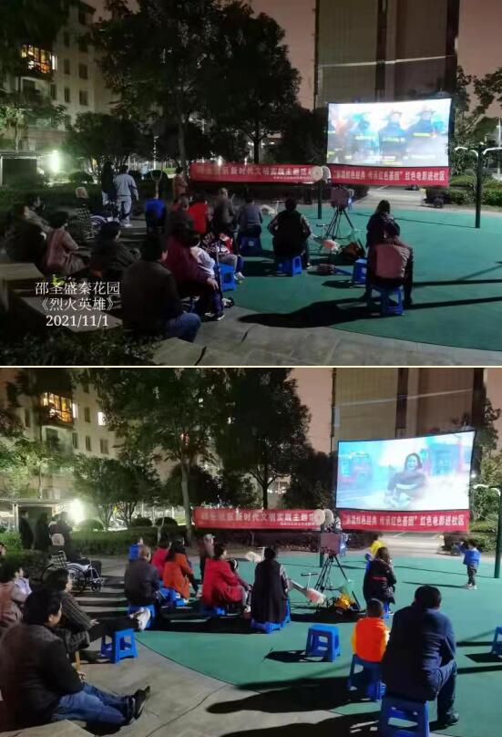 月上柳梢頭,人約黃昏后。隨著夜幕降臨,邵圣社區(qū)的居民紛紛來到花園操場中央,觀看改編自“大連7.16大火”真實事件的電影《烈火英雄》。黑夜悄悄的來臨,夜色下大火焚燒整個熒幕,炙熱和窒息讓熒幕前的居民們猶如置身于火海中,烈火下英雄聲嘶力竭的吶喊聲如歌如泣,扣人心弦。居民們?nèi)褙炞ⅲ瑹o不為電影中的英雄之震撼,為英雄不怕犧牲,甘于奉獻的精神而敬畏。