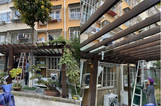 據(jù)悉,此違建屬于歷史違建,是小區(qū)居民私占綠化區(qū)域搭建的花架,大小約10㎡左右,主要想用來停放電瓶車,養(yǎng)花,以及葡萄種植。
