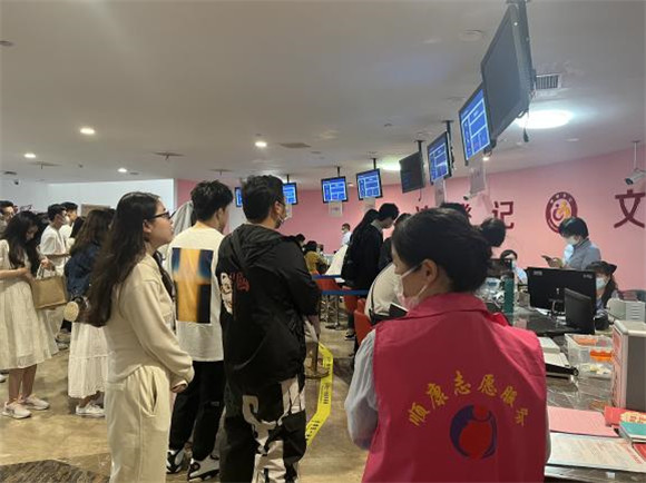 2023年5月18日的數(shù)字組合可以解釋為“佳人成雙,白頭偕老”,同時又諧音為“我要發(fā)”,是一個典型和諧、美好的陰陽組合。5月18日,江寧婚姻登記處已預(yù)約100余對等待結(jié)婚的新人。