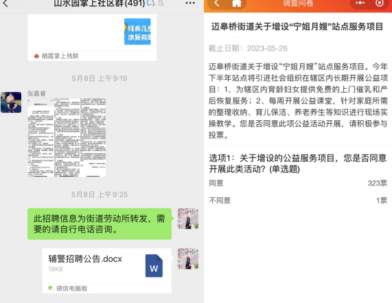 “群主,你好,我是一名下崗寶媽,想在家附近找一份工作,社區(qū)這邊有沒有能夠提供就業(yè)信息。”在掌上云微信群內(nèi)有居民向社區(qū)求助,群主在接到信息后,第一時(shí)間與其取得了聯(lián)系,并就其問題為她聯(lián)系了南京市棲霞區(qū)邁皋橋街道山水園社區(qū)寧姐月嫂工作站,幫助其進(jìn)行就業(yè)培訓(xùn),提供暖心的公益援助。