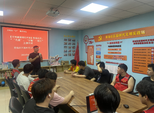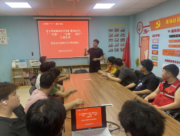 2023年6月2日,果場社區(qū)依托新時代文明實踐站,組織社區(qū)“齊益果”積分制志愿者、新業(yè)態(tài)新就業(yè)群體、青年居民們在社區(qū)一樓文明實踐文化陣地開展了“文明有‘寧’ 攜手同行”主題宣講,宣講標題為:“光盤、空瓶”一起行。