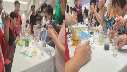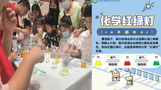 瓶?jī)?nèi)溶液會(huì)由綠變紅最終呈現(xiàn)黃色,宛如交通紅綠燈??吹筋伾兓臅r(shí)候,少年兒童們都瞪大了雙眼,驚嘆道:“好像馬路上那個(gè)交通信號(hào)燈的顏色呀!”