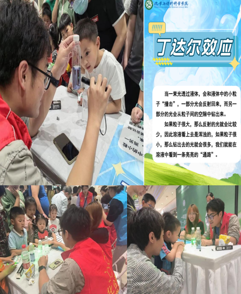 “丁達(dá)爾效應(yīng)”出現(xiàn)的時(shí)候,光就有了形狀。當(dāng)一束光透過(guò)膠體時(shí),會(huì)和液體中的小粒子“撞擊”,一部分光會(huì)反射回來(lái),而另一部分的光會(huì)從粒子間的空隙中鉆出來(lái),便可以在側(cè)面觀察到明亮的光線軌跡的丁達(dá)爾現(xiàn)象?;顒?dòng)中,少年兒童們?cè)谘b有洗衣粉溶液的膠體中看到了清晰的光束,但是在鮮牛奶乳濁液、藍(lán)墨水的水溶液中沒(méi)有觀察到現(xiàn)象。最后講師又向少年兒童們科普,如果把牛奶稀釋到一定的倍數(shù),牛奶就從乳濁液變成了膠體,也能觀察到明顯的光路。