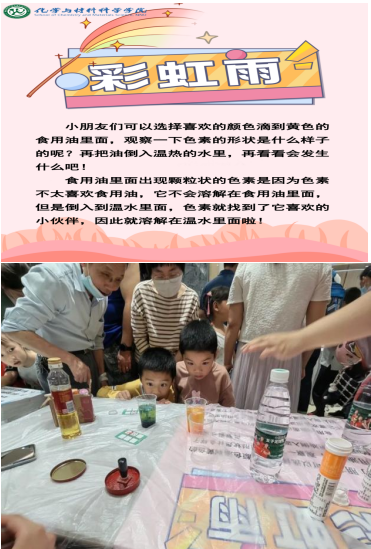 “彩虹雨”的基本原理是溶質(zhì)在溶劑中溶解性差異。色素在食用油中是以小球體的形式存在的,但是在水中卻能快速溶解,形成一縷縷“彩色綢緞”,向水面擴(kuò)散??吹浆F(xiàn)象后,少年兒童們眼睛都亮亮的,閃爍著驚喜的光芒。